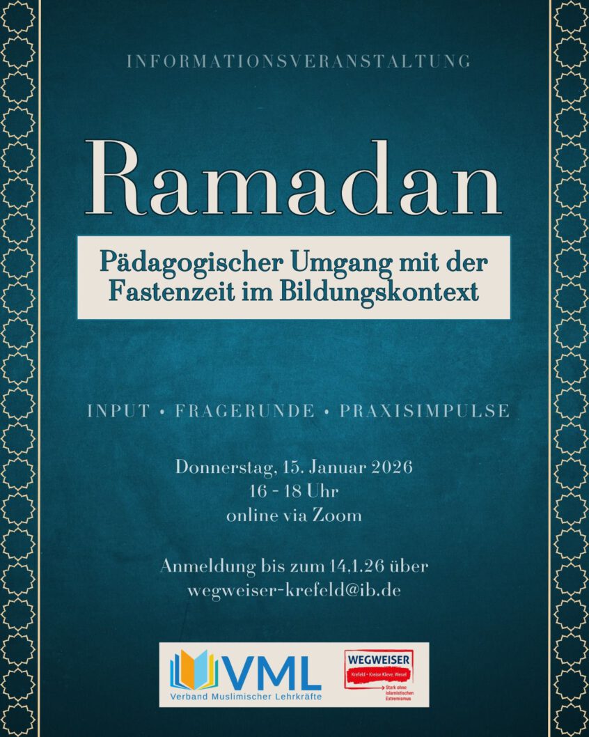 In Kooperation mit Wegweiser in Krefeld und den Kreisen Kleve und Wesel laden wir Sie herzlich zu unserer Informationsveranstaltung anlässlich des bevorstehenden Fastenmonats Ramadan ein. Die Veranstaltung findet am 15.01.2026 von 16-18 Uhr online statt.